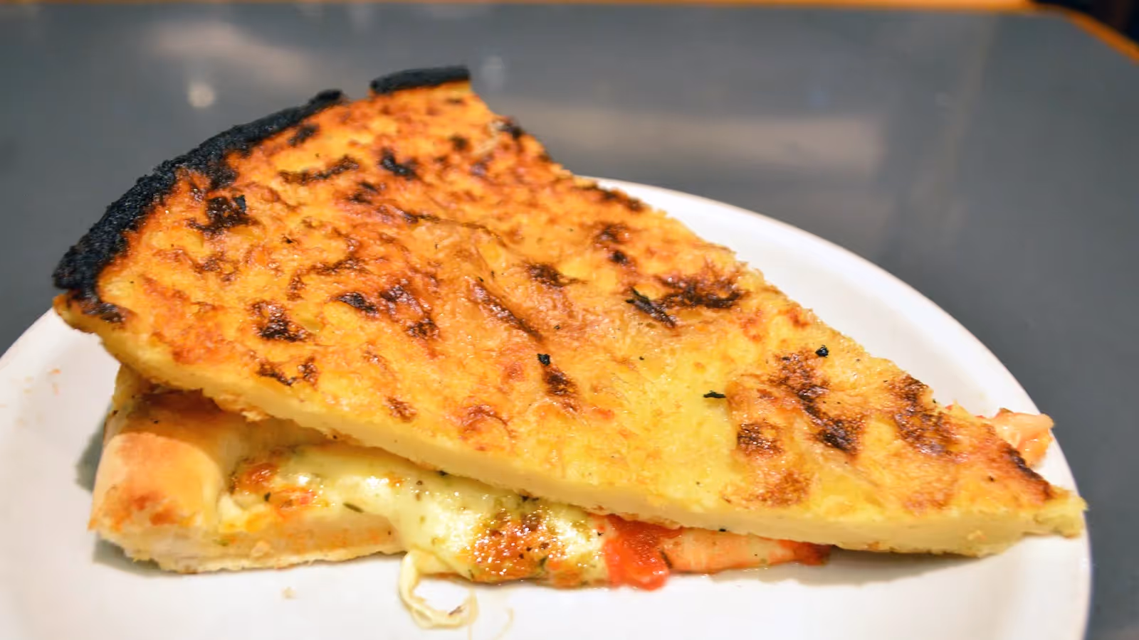 Every so often, he turned to a stack of what look like crumbly pieces of pizza base and flicked a portion onto a slice as he served it. The result looked like a pizza sandwich, the mozzarella melting slowly out from between the layers. This extra topping isn't actually from pizza at all but a thick, baked chickpea pancake called fainá.