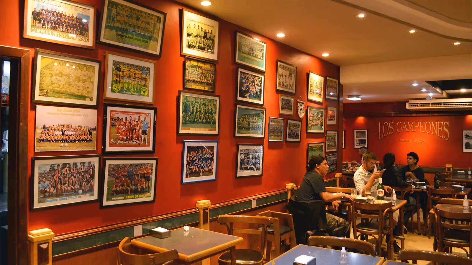 In Los Campeones, a pizzeria five blocks from the Boca Juniors stadium, it's clear that the link between fainá, football and popular culture remains alive and well. The walls are a mosaic of photos of sporting greats. The night I was there, the team was playing a Copa Libertadores match, and the waitstaff's eyes were glued to the game.