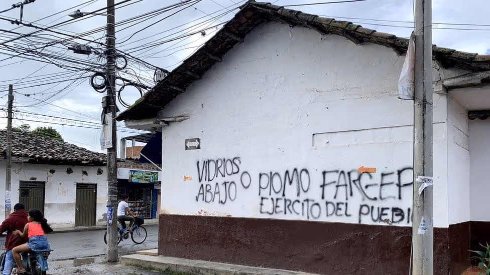 "Windows down or bullets," reads one graffitied wall, and it is signed "FARC-EP", short for the Revolutionary Armed Forces of Colombia - the People's Army. It is a warning to drivers to make themselves known and is repeated on many walls in Corinto, in Colombia's south-west Cauca province.