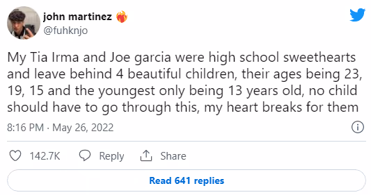 “EXTREMELY heartbreaking and come with deep sorrow to say that my Tia Irma’s husband Joe Garcia has passed away due to grief,” Martinez tweeted. “I truly am at a loss for words for how we are all feeling, PLEASE PRAY FOR OURFAMILY, God have mercy on us, this isn’t easy.”