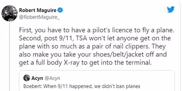 Robert Maguire on Twitter: "First, you have to have a pilot’s licence to fly a plane. Second, post 9/11, TSA won’t let anyone get on the plane with so much as a pair of nail clippers. They also make you take your shoes/belt/jacket off and get a full body X-ray to get into the terminal." / Twitter