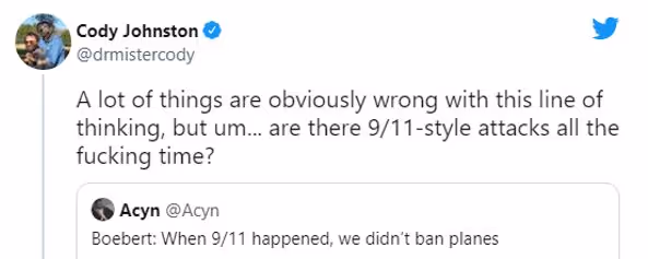 Cody Johnston on Twitter: "A lot of things are obviously wrong with this line of thinking, but um... are there 9/11-style attacks all the fucking time?"/ Twitter