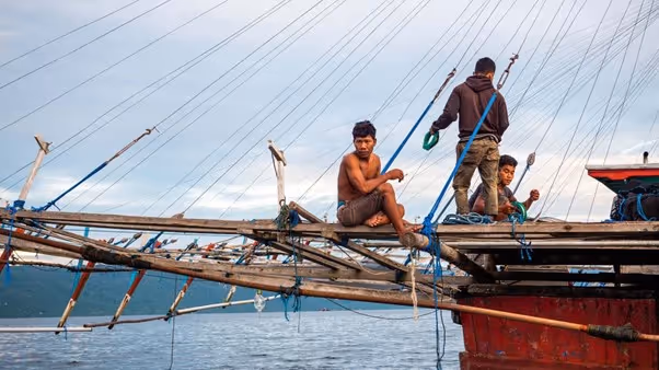 The bagans are built by the Bugis, a maritime people who originated in southern Celebes (now known as the Indonesian island of Sulawesi),who are often referred to as "sea gypsies" or "sea nomads". The Bugis spend the majority of their lives at sea on their bagans, moving long distances in search of the richest fishing waters. Over generations they havedeveloped an extraordinary relationship with the whale sharks who feed each morning beneath their nets, sucking succulent sardines through the tinyopenings.