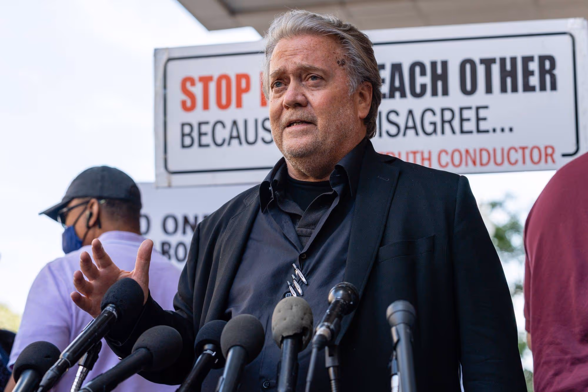Former Trump White House chief strategist Steve Bannon speaks with the media during the opening day of his trial on contempt of Congress charges stemming from his refusal to cooperate with the U.S. House Select Committee investigating the January 6, 2021 attack on the Capitol, at U.S. District Court in Washington, July 21, 2022. (Reuters/Michael A. McCoy/File Photo)